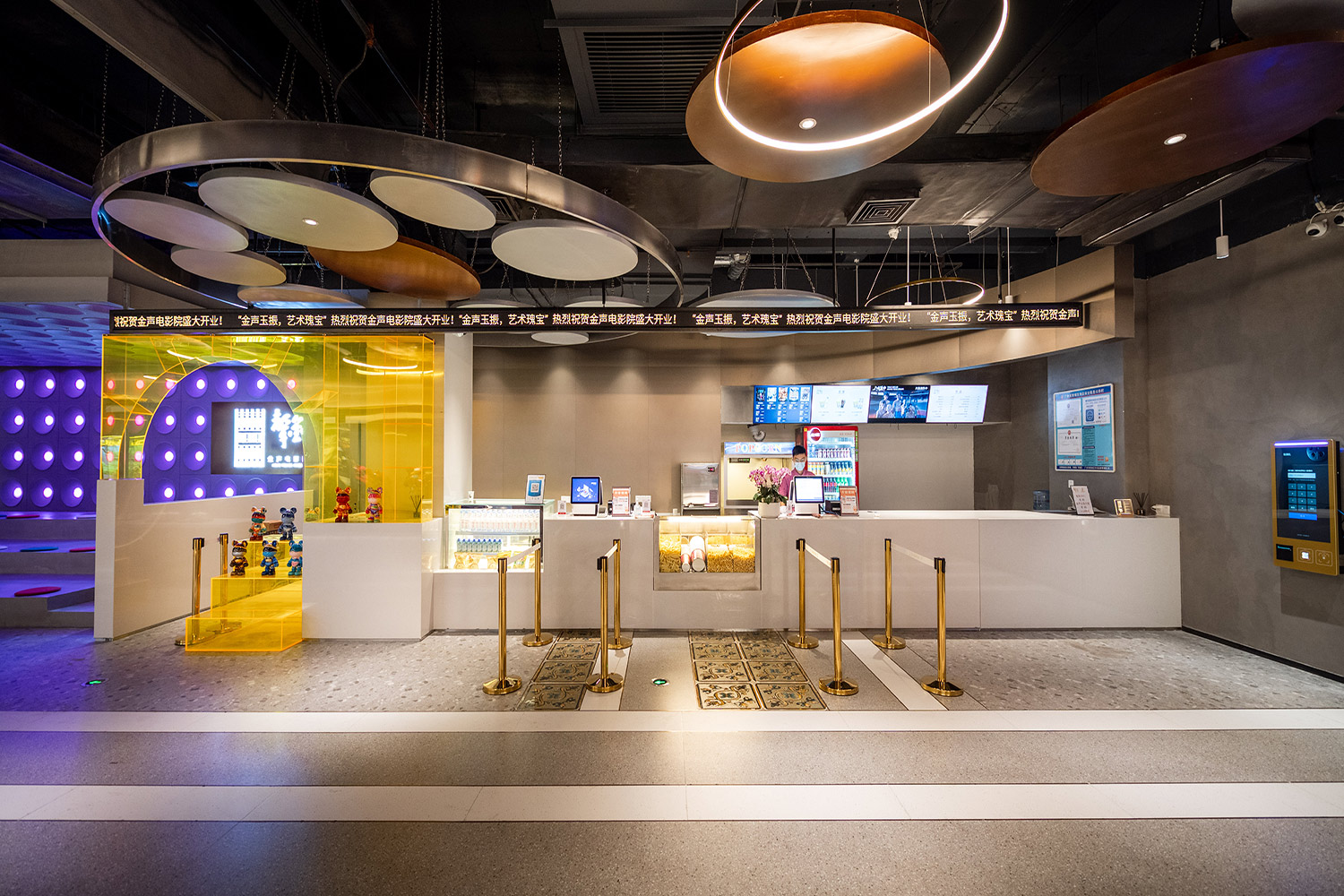 金聲電影院建成于1934年,舊址位于廣州西關(guān)老城區(qū)恩寧路,影院建成后,曾轟動(dòng)一時(shí),當(dāng)時(shí)戲院占地面積2千多平方米,曾稱為“全市影院中之最宏偉者”,是著名綜合娛樂場(chǎng)所。同時(shí)也是廣州第一家有冷氣的影院,坊間流傳:“人皆苦炎熱,我愛金聲涼”的名頭便是由此而來?!靶陆鹇暋钡恼w布局由“重現(xiàn)金聲”(影廳區(qū)域)“藝術(shù)金聲”(公共區(qū)域)“創(chuàng)意金聲”(大堂區(qū)域)三部分構(gòu)成。在籌備團(tuán)隊(duì)的精心策劃下,于影院內(nèi)陳列放置了金聲電影院舊址的騎樓裝飾,并將影院的7個(gè)影廳分別以7座大家耳熟能詳?shù)睦献痔?hào)影院命名,他們分別是:中華、樂善、明珠、新華、新星、長壽、美華。這一個(gè)個(gè)陪伴了廣州市民童年歲月的老字號(hào)影劇院,將以這種特殊的方式得以重生,在“新金聲”的懷抱中,用光影續(xù)寫新的篇章。在公共區(qū)域的裝修設(shè)計(jì)上,影院結(jié)合廣府文化元素,參考舊址外立面的建筑特色,利用現(xiàn)代設(shè)計(jì)手法,打造極具西關(guān)特色的電影藝術(shù)空間。為更好體現(xiàn)“人皆苦炎熱,唯有金聲涼”這一句曾家喻戶曉的美譽(yù),影院大堂通過玻璃、鏡面、亞克力等材質(zhì),使影迷在進(jìn)入瞬間開始便能感受到金聲電影院所帶來的歷史文化的厚重感。在公共區(qū)域,通過“策展+”的方式以“百年金聲”為常態(tài)展覽主題